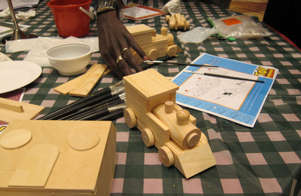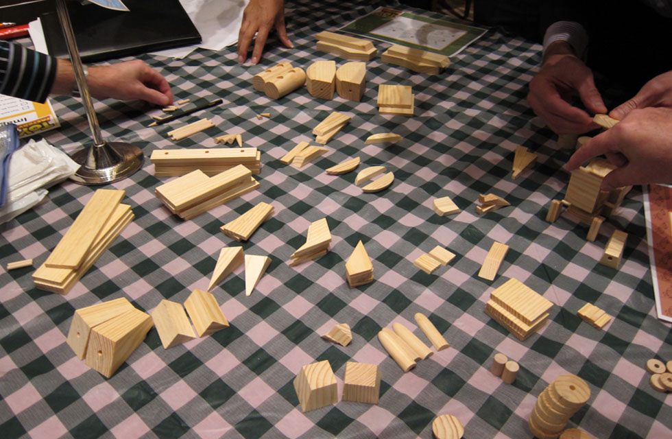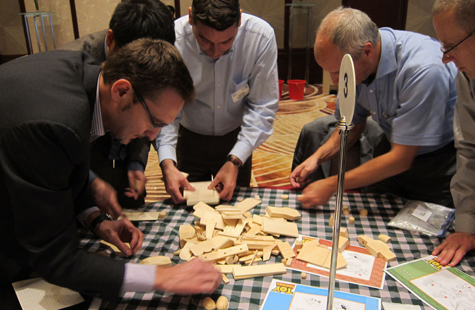 We provide teams with a selection of wooden parts in various sizes and shapes. Their challenge is to combine the components to produce a range of high-quality children’s toys. Three-dimensional blueprints guide them through the process and detail a whole range of toy designs.