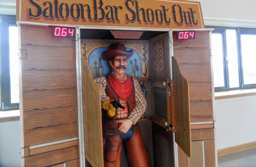 As the Saloon Bar Doors open, be the first to shoot the Cowboy, drawing your replica revolver from your holster. as he raises his gun and the 'Draw' sign illuminates! See if you can be the quickest gun in the West!