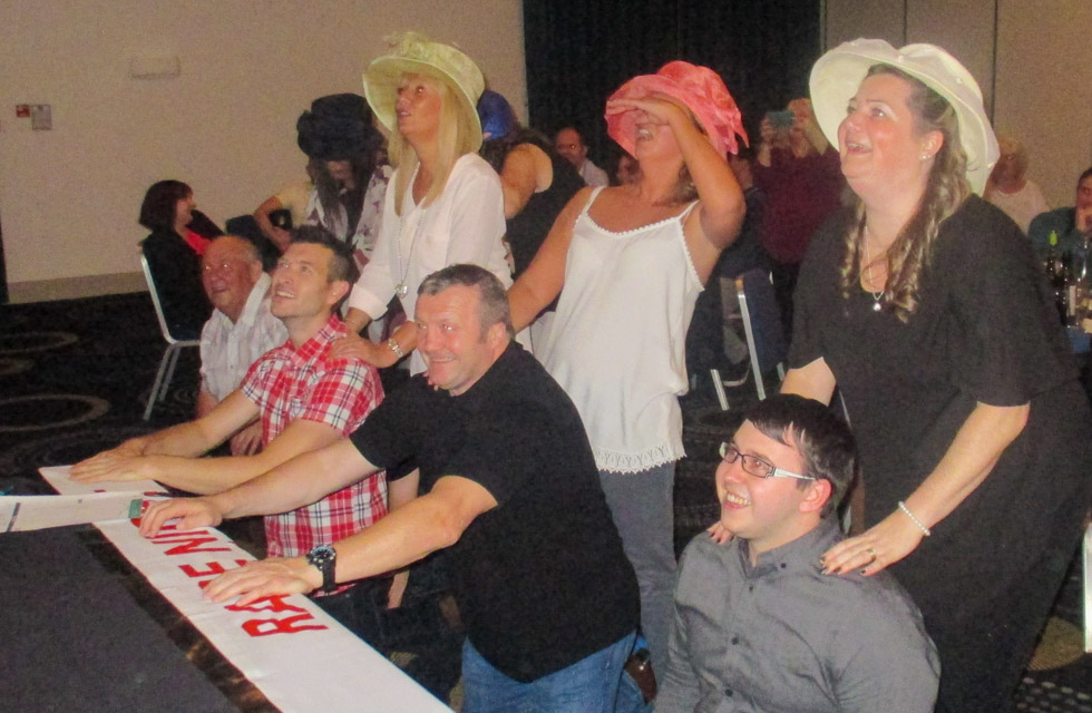 Each table plays as a team with an initial budget, which they gamble on the various races throughout the evening, visiting the ‘bookies’ to place their bets on the audio-visual set races.