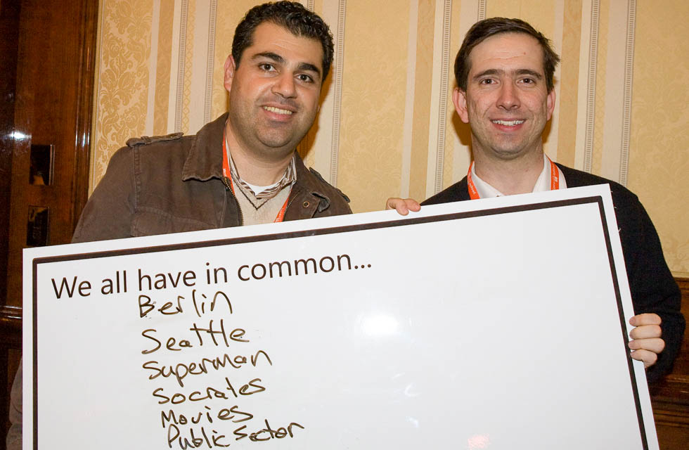 We start with a warm-up exercise to get participants into teams. Then individuals are tasked with gathering as many business and personal commonalities with the other players as possible to win points for their team.